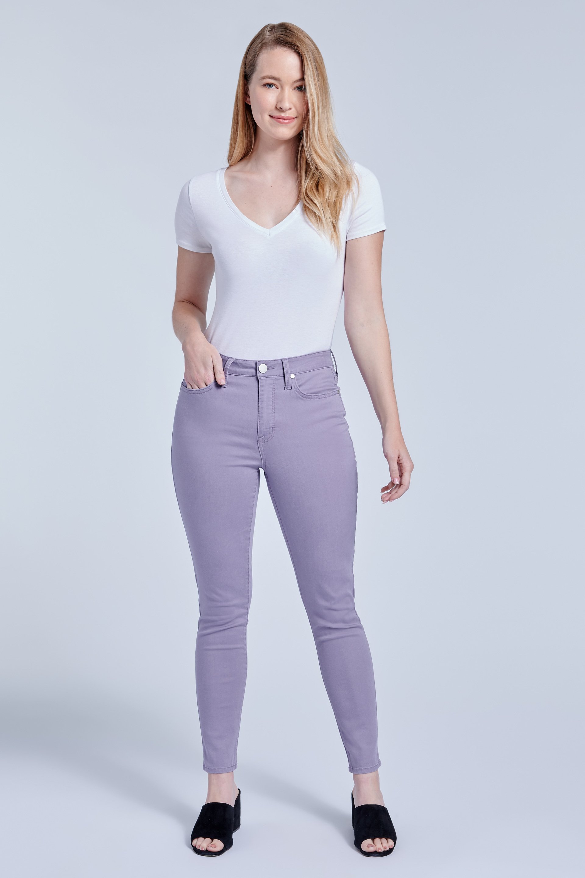 Light and bright, these ankle-length skinny jeans have a high rise that emphasizes curves and a clean five-pocket silhouette. Their comfortably cool cotton-modal stretch denim makes them ideal for warmer weather.