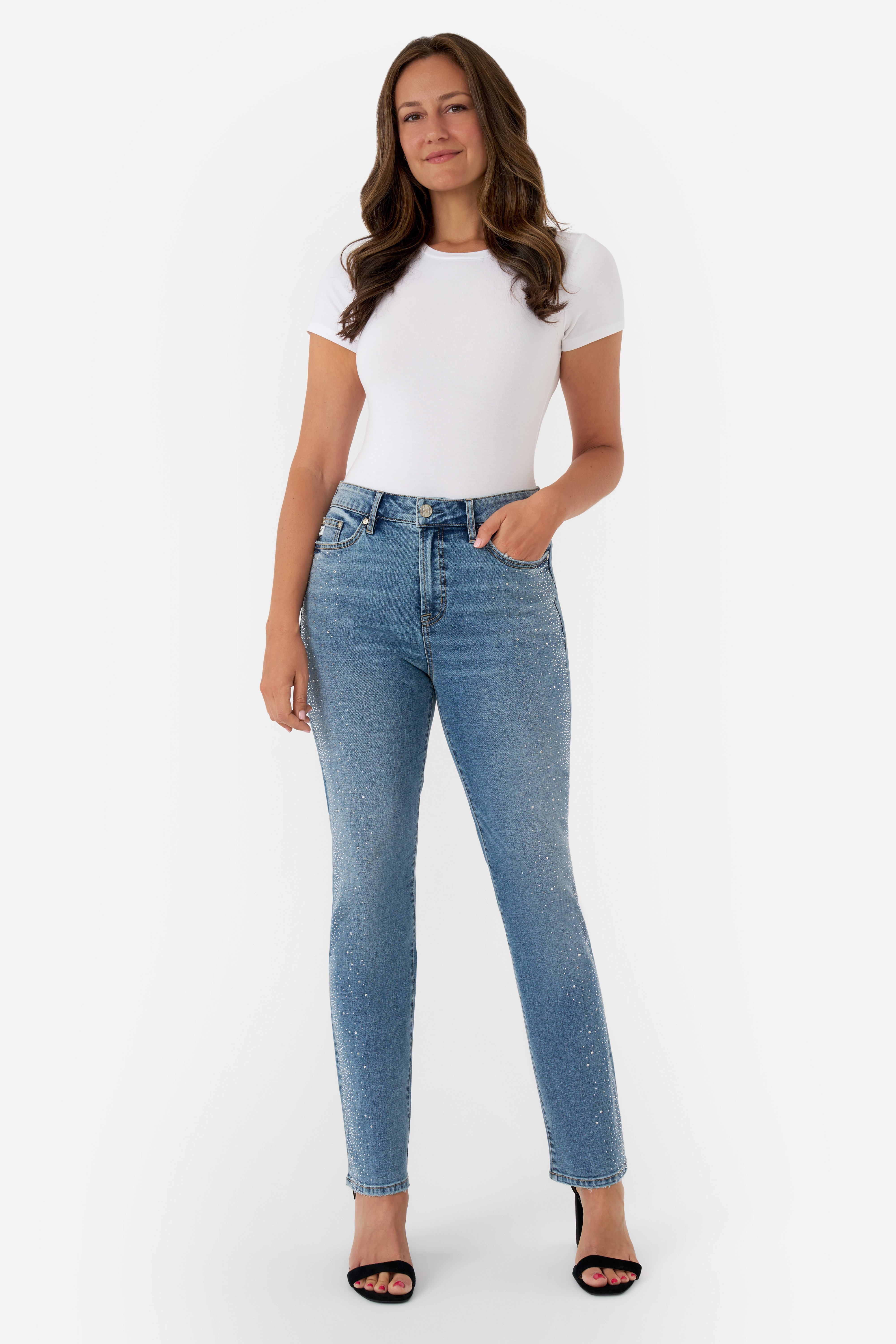 A vintage-inspired straight leg with a touch of modern glamour. This high-rise jean is crafted in premium stretch denim, softened with a lived-in finish and elevated by shimmering crystal embellishments for an effortlessly chic statement.
