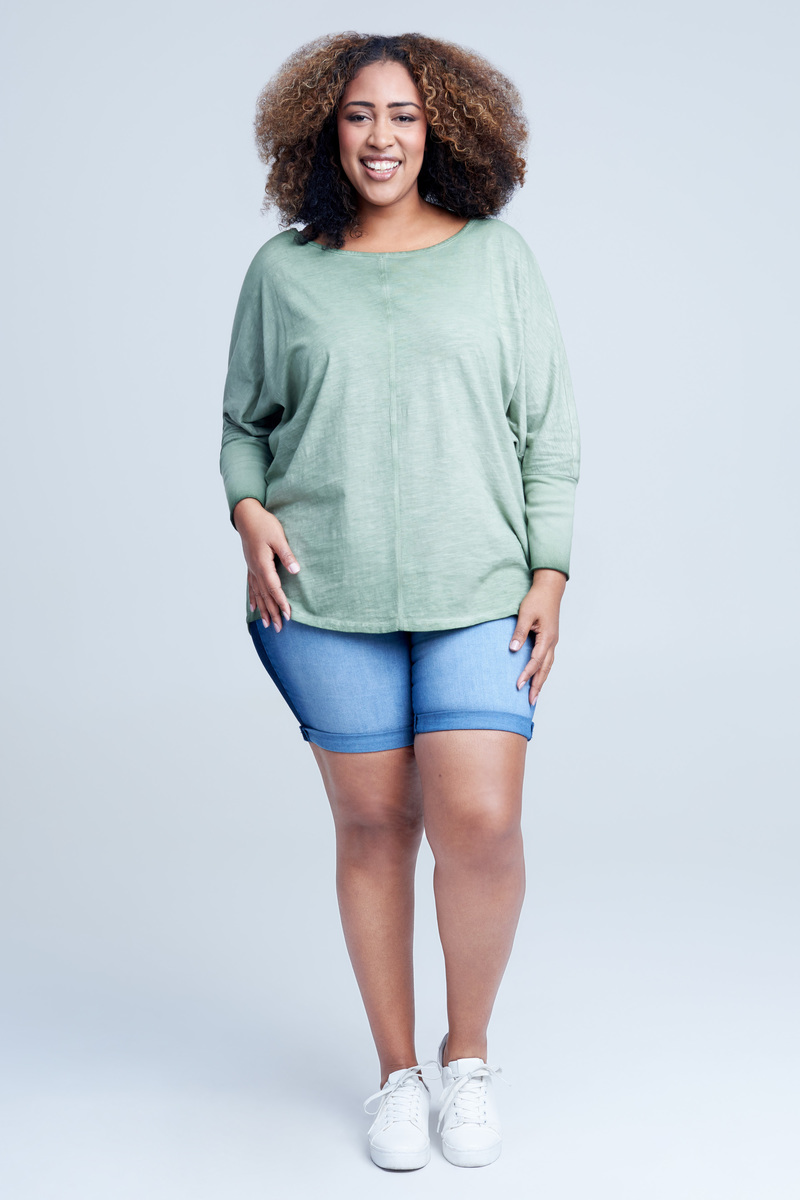 A relaxed long-sleeve top featuring a rounded neckline and dolman sleeves with wide, ribbed cuffs is one of those pieces you'll wear on repeat. Made from comfy knit jersey, it's got seam detailing down the center and has a slightly uneven color treatment that makes each piece unique.
